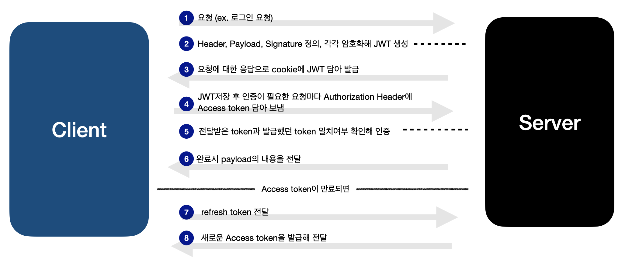 - Client는 JWT를 저장하고, 이후 인증이 필요한 요청마다 Authorization Header에 Access token을 담아 보냄
